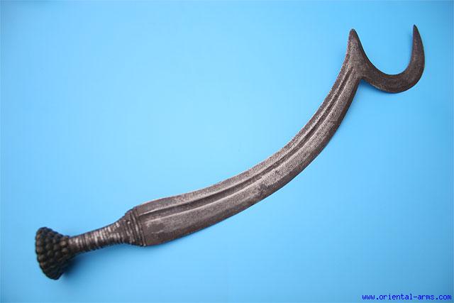This one is really unusual – An interesting mix of a saber and a throwing knife. Probably from Zaire, Azande people. Early 20C. Double curved and dual edged blade, finely forged with long fuller and decorated with simple engraved geometrical design. Wood handle bound with iron strips and pommel covered with brass tacks. Blade 19 inches. Total length 24 inches. Very good condition. Good age patina on all parts. Very scarce item. |