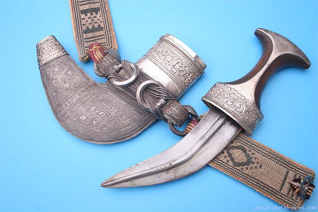 A very good Arab Jambiya dagger, mid 20 C. from Oman. It has a 7 ½ inches curved and dual edge blade of good steel with a pronounced central rib. The hilt is hardwood covered silver front panel and mounted with chased silver collar. The scabbard is “L” shaped covered with leather elaborately embroidered with silver strips and wires, and mounted with chase silver locket en suite with the hilt mounts. The belt attachment is made of complicate arrangements of silver rings and twisted silver wire. Total length is 12 inches. Original brocade belt. Very good condition. Impressive example of the famous Arab Jambiya. |