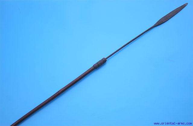 This hunting spear is probably coming from Tanzania or the neighboring countries in South East Africa. Good example, early 20 C. Blade is 8 inches with a 10 ½ inches tang. 27 inches narrow wood haft with a steel tail. Total length 48 inches. Very good condition with good age patina on the steel parts. |
