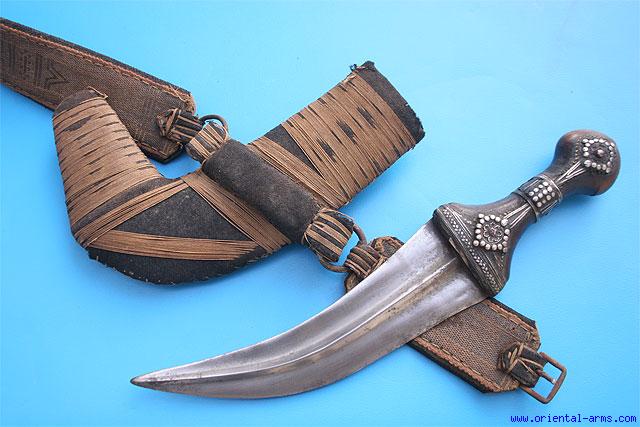 A very good and early Arab Jambiya dagger, mid – late 19 C. from Oman. Massive 8 inches curved and dual edge with a pronounced central rib. The hilt is Rhino horn with silver filigree decoration. The scabbard is “L” shaped covered with fabric. Original brocade belt. Very good condition. Heavy dark age patina on the horn handle. |