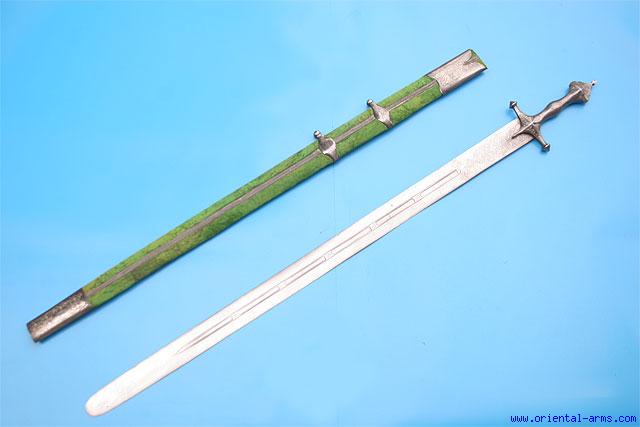 We offer for sale this very fine and beautiful 19 Century Persian straight sword also known as Revival sword, as it was reviving the use of old 15 C style Islamic straight swords. This beautiful blade is 37 inches long, 2 inches wide at the top, finely sectored fullered and with elaborately chiseled panels on its two faces in the typical Qajar style. The entire blade surfaces are finely etched in a pattern reminding wootz steel. The hilt and scabbard mounts are steel decorated with silver koftgary work. Original scabbard, covered with green velvet (later). Total length 43 inches. Very good condition. |
