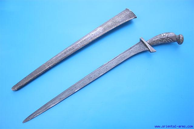 The Pedang Lurus is an Indonesian short sword, common in Java but can be found also in other Indonesian islands. This one is one of quality. The blade is 21inches almost straight with a slightly down curving double edge tip. It is forged from good pamor steel. The hilt is worked in silver in an elaborate design. The scabbard is wood covered with silver sheet chased in a very intricate design. Total length 22 ½ inches. Very good condition. Fine item, dated probably to the second half of the 19 C all original.