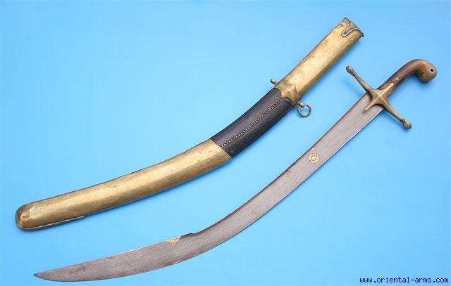 The Kilij is the traditional saber of the Ottomans. It was in use from the early 17 C. and during more than 300 years well into the 20th C. The shorter version with deeply curved wide blade and ‘T’ spine, sometime known as Pala, is a later version and appeared in the mid 18 Century. This Pala has a blade of 27 inches, forged from Sham (Low contrast watered steel) and decorated with gold koftgari work. The hilt of classical form is made of brass cross guard and horn grips with bulbous pommel and brass grip strap. The wood scabbard is covered with the original leather cover with spiral stitching and mounted with big brass locket and chape. Total length 34 inches. Very good condition. Age cracks on the grips but they hold solid. |