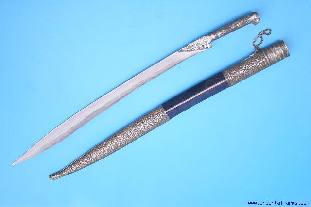 This Very Yataghan sword is Turkish, mid 19 C. Well forged blade with heat hardened edge, Silver on pewter Grips and bolsters and silver bolsters. Scabbard covered with blue velvet (later) and mounted with long and very nicely chased silver locket and chape. Blade 24 inches, total 32 inches. Very good condition. Minor scratches on the blade. Light damage on the right pommel ear. An impressive Yataghan sword. |