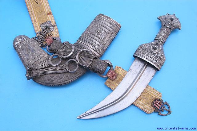 This fine quality Arab Jambiya dagger is from Oman, in the royal style known as Saidi . It has a well forged, 7 inches long, 2 inches wide, curved and dual edge blade with a central rib. The hilt is made of silver with many small silver filigree pieces soldered together. The scabbard is “L” shaped covered with delicate embroidery of silver strips on leather. The belt attachment is made of complicate arrangements of 7 silver rings and twisted silver wire. All scabbard and hilt fittings are silver in a typical filigree design. This item comes with its original 2 inches wide embroidered belt in gold and black colors, and a silver buckle. Total length with belt fully stretched 31 inches. Very good condition. |