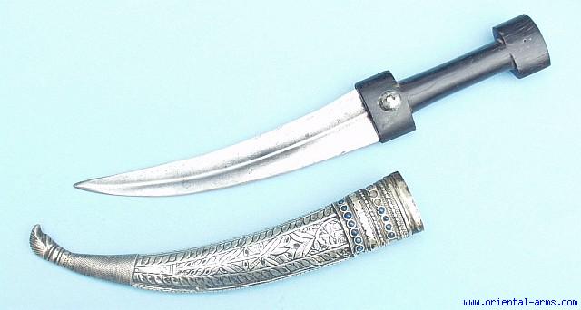 A beautiful Jambiya Dagger from Kurdistan. The blade is 8-½ inch long (point to point) curved and double edge with a central rib. The hilt is “I” shaped cut from black horn. An old silver coin is used as disk for the tang rivet, but it is too worn to identify. The scabbard is made of chased and engraved silver in a typical Kurd style and set with two rows of small turquoise stones. Total length in scabbard is 15 inches. Good condition. Good blade with very minor pitting. This is an authentic and old late 19th Century piece in very good shape and condition and a treasured addition to any collection of oriental weapon.