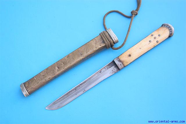 This small knife is coming from Tibet, early 20 C. Heavy fullered blade that has seen use, 5 ½ inches long. Bone / horn grips and flared pommel of several metal and horn layers. Brass scabbard with white metal bands and original carrying thread, Total length 11 inches. Very good condition. Real knife that has seen use. |