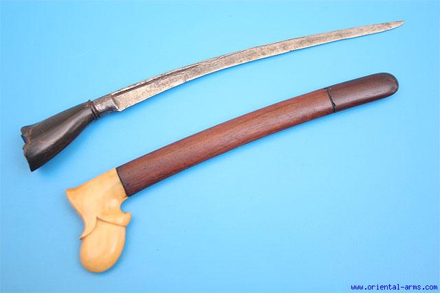 This Sewar knife is from Sumatra late 19C. The blade is narrow, down curving, 8 ½ inches long, forged from laminated pamor steel. Carved horn handle. Finely grain wood scabbard with ivory mouth. Total length 12 inches. Very good condition.