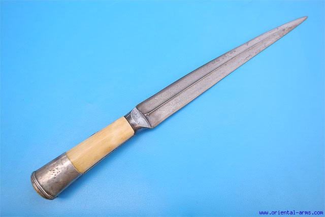 This kard is a most interesting Indo-Persian blade. A slender very slightly curved double edge blade 9 ½ inches long, with a central rib, forged from beautiful wootz (Damascus) steel. Steel bolsters, ivory grips and chased silver grip strap. Total length 14 inches. Very good condition. A later silver band on the pommel is added may be to conceal a crack or a damage to the grips. |