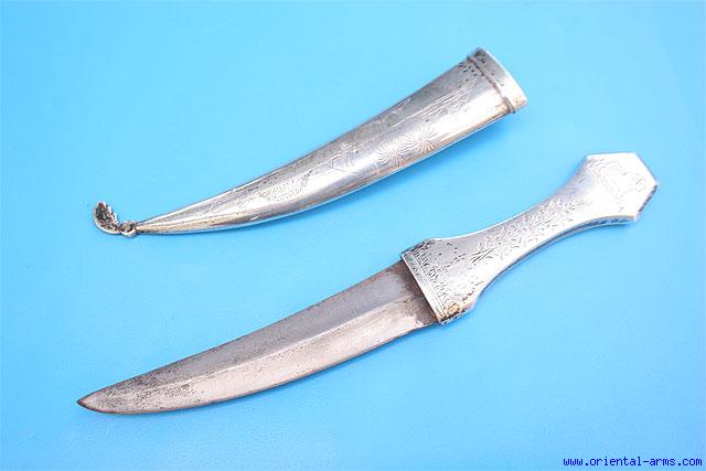 This Jambiya dagger is comong from Iraq, employing an early blade, probably mid 19 C. with a later, mid 20 C. handle and scabbard. The blade is 6 inches long, curved and double edged with a central rib. The handle and scabbard are heavy silver, very finely engraved with flowers and typical Iraqi river scene. Total length 12 ½ inches. Very good condition.