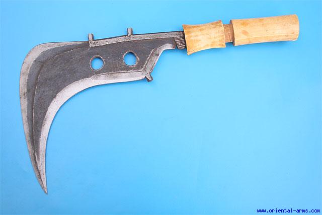 The knife of the Mangbetu people residing in Central Africa was originally used as a weapon of war and also as an agricultural implement, but later on developed into luxury item and a symbol of status. One of the photos show a late 19 C drawing of Munza the king of the Mangbetu on his throne, holding high a similar knife as a symbol of power and authority. This one is a fine late 19 C.,with a larger than usual sickle shaped. 12 inches (point to point) blade, very well forged. The original blackening of the steel with the polishaed edges is, maintained. Massive one piece ivory grips with very good yellowish age patina. Total length 17 inches. Very good condition. A fine early and authentic piece. |