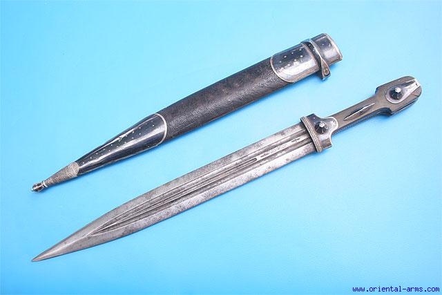 This Qama dagger is from Dagestan, late 19 C. with the blade made by Abdurahim, a known sword maker of the period. The multifullered blade is 12 ½ inches long marked with two birds with the name (worn) signed between the birds. Horn grips. Original leather covered scabbard with blackened silver mounts. Total length 19 inches. Very good condition. Blackened spots on the blade. |Minor damage to the scabbard. |