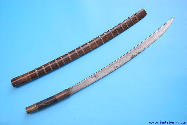 This Dah sword is a good fighting sword, second half of the 19 C. Relatively thick blade with ridged spine 22 inches long. Wood grip with brass mounts. Wood scabbard bound with rattan bands. Total length 32 inches. Very good condition. Minor chip on the scabbard. The scabbard binding is restored. |