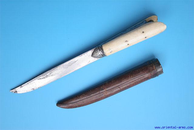 This is a very good and typical example of the knife from the island of Crete in the Mediterranean. The T spine 7 inches blade is single edge engraved with a typical design and dated 1892 (worn dating). Handle with bone grips widening toward the pommel in a form of split ears. The bolster and grip strap are silver plated. Wood scabbard covered with brown leather. Total length in scabbard 12 inches. Very good condition. A nice late 19C typical Crete knife.