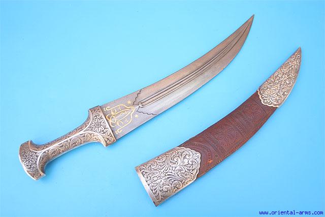 This very fine Khanjar / Jambiya is Turkish, early 19 C. Very finely forged blade, Wootz (Damascus, watered) steel. With gold inlay on both sides, in styled calligraphy the word: YA ALI . Finely chiseled silver handle and scabbard mounts over tooled leather. Silver parts are proof marked. Blade 11m total 17 inches. Very good plus condition. The scabbard chape is a later professional restoration. |