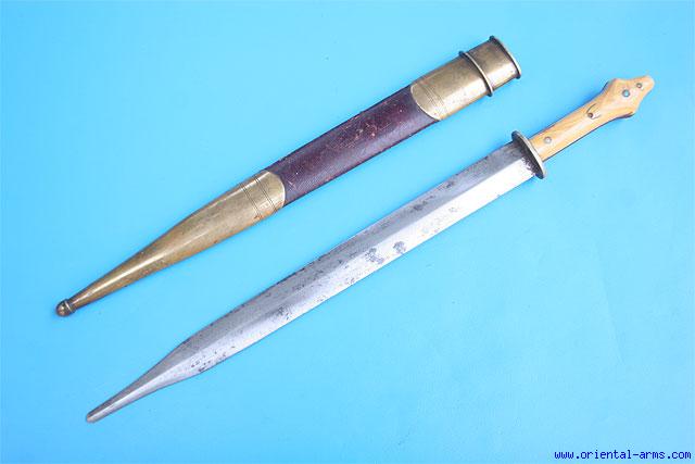 This dagger is Turkish, mid – late 19 C. in the general style of a Qama dagger. The blade of flat diamond cross section is 14 inches. Elephand ivory grips set with turquoise stones. Leather covered scabbard with brass mounts. Total length 20 inches. Very good condition. |
