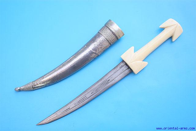 Up for sale this 19 C. fine Ottoman / Balkan (probably Albanian) Jambiya dagger. Blade of earlier period, probably early 18 C. 10 inches long forged from low contrast watered steel. Long handle cut entirely from a single piece of walrus ivory with extended pommel and cross guard corners, a shape attributed to Albania. Wood scabbard covered with silver with filigree work proof marked on the back. Total length 17 ½ inches (in scabbard). Very impressive item. |