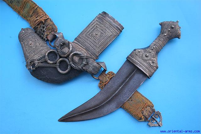 We offer for sale this Arab Jambiya dagger from Oman, in the royal style known as Saidi . It has a well forged, 7 ½ inches long, curved and dual edge blade with a central rib. The hilt is silver in the classical “I” shaped, decorated with many small silver filigree pieces. The scabbard is “L” shaped covered with leather and fabric. The belt attachment is made of complicate arrangements of 7 silver rings and twisted silver wire (Rare style). All scabbard and hilt fittings are silver chased in a typical design. Thyis dagger comes with its original brocade belt. Very good condition. Very good age patina on the blade and on the silver parts. The belt is worn. |
