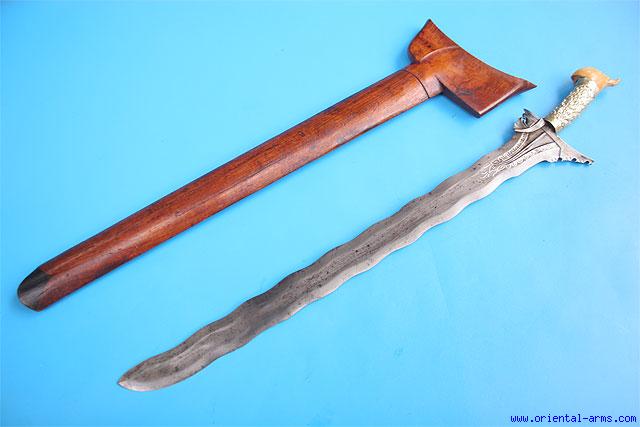 This Moro Kris sword is probably an early one, mid – late 19 C. The wavy and fullered blade is of laminated core forge welded to high carbon steel edge with silver inlay decoration on the top. Silver reinforcing band secure the blade to the handle. Grip bound with gold colored metal (probably gilded silver). Cockatoo style ivory pommel. Original wood scabbard. Blade 22 inches, total 29 inches. Very good condition. Early repair on the pommel. The style and dimensions of the blade suggest the early age. |