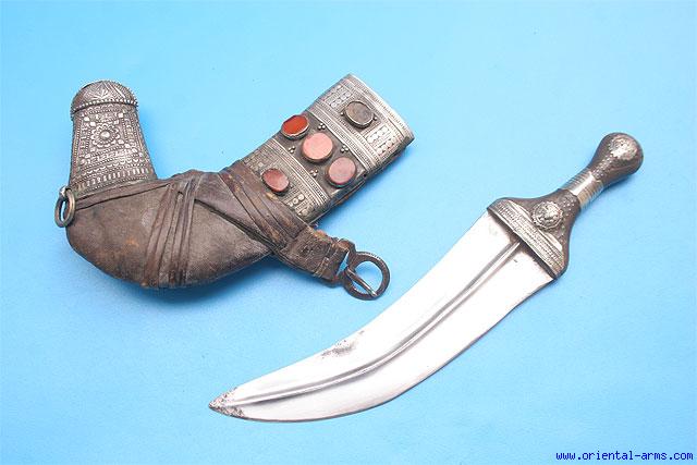 This Jambiya dagger is Yemenite, early 20 C. Well forged blade 8 inches long with a pronounced central rib. Horn grip with silver mounts and iron nails decoration. Leather covered scabbard with silver mounts and Carnelian stones (one missing). Total length 12 inches. Very good condition. The belt arrangement and the Chape reminds of the Omani khanjar which certainly influenced the maker of this dagger. |