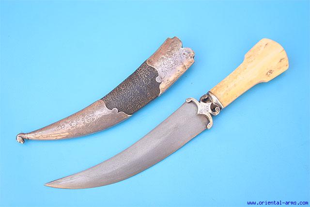 We offer for sale from our private collection this Turkish Jambiya dagger, late 18 C., in the style of earlier 16 and 17 C. daggers. Wootz blade 7 inches long with a nicely engraved silver cross guard. Walrus ivory grip. Scabbard with engraved silver mounts. Total length 12 inches. Very good plus condition |