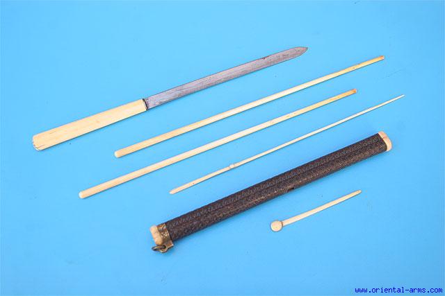 A Chinese ‘trousse’ (eating set), comprising a knife and chopsticks. This type of sets was very common in china and in all the countries under the Chinese influence from Tibet to Mongolia. It was part of a man formal dress up to the turn of the 20th century and usually accompanied with a variety of accessories like pickle spear, toothpicks, tweezers and the like. Similar sets are found in various sizes and quality. This one is a very fine one. The blade is 7 ½ inches long very well forged from laminated steel with heat hardened edge. Ivory grip. Finely carved black wood (Ebony ??) scabbard with brass and ivory mounts. Ivory chopsticks, picl]kle spear and tooth pick. Total length 12 inches. Very good condition.