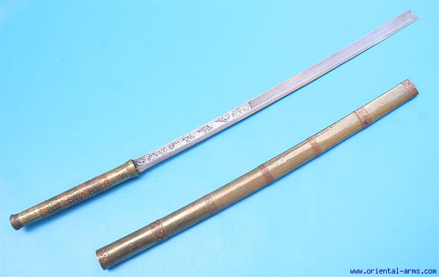 This Dah sword is probably Burmese (or may be Thai), early – mid 20C. The blade is 24 inches, very well forged with a concave cut tip. The blade is beautifully inlaid with silver on the forte and on the spine. The two handed grip is bound with alternating bands of pierced copper brass and bronze. Wood scabbard covered with brass and copper bands. Total length 33 inches. Very good plus condition. |