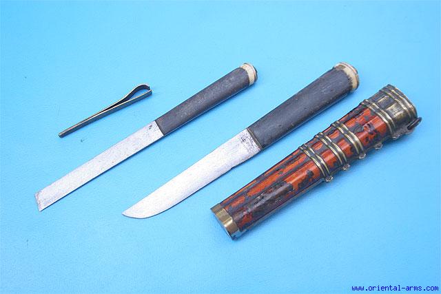 This set of knives is Chinese, late 19C. It includes a small knife, a chisel and a brass tweezers. The blades are 3 ½ inches long. The handles are black horn with bone pommels and brass pommel caps. Wood scabbard covered with orange / red lacquer and mounted with brass fittings. Total length 8 inches. Very good condition. Losses to the lacquer cover. |