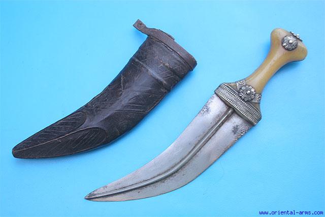 This Jambiya dagger is Yemenite, comoing from South Yemen and known also as Hejaz Jambiya. It is early 20 C. Massive blade with pronounced central rib 8 inches long. Handle of Amber like material with silver mounts and chased silver back side. Tooled leather scabbard. Total length 13 ½ inches. Very good condition. |