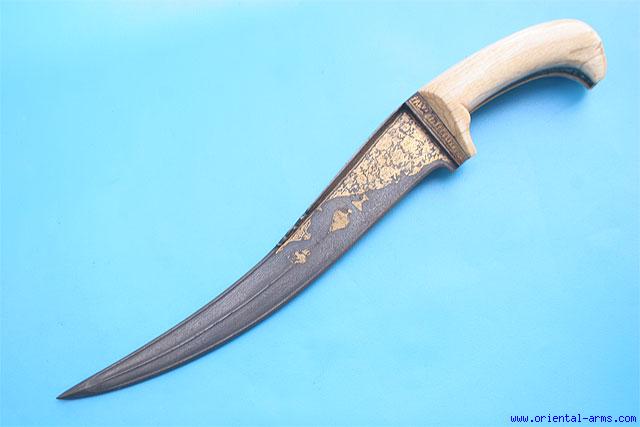 Up for sale is a very Fine Indian Pesh-Kabz dagger, late 18 – early 19 C. It has a fine wootz blade with high contrast pattern 11 1/2 inches long with swolen tip for armor piercing. The blade is richly decorated with gold koftgari work. Elephant ivory grips with good age patina. Total length 16 inches. Very good condition. Original deep blade etching. Minor chips and repair on the grip. No scabbard.