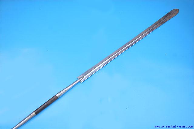 From southern Kenya, where the Massai people reside comes this spear. It is also known as Lion Spear supposedly used by young warriors to hunt a lion as a proof for their courage and manhood. True story?? We do not know. This one is early to mid 20 C. Heavy very long blade, 31 inches long with a central rib and 6 inches socket. 32 inches long steel tail. Short wood handle in the center. Total length 81 inches. Very good condition. This lot was nickel plated, probably by its last owner. A very attractive and decorative item. |