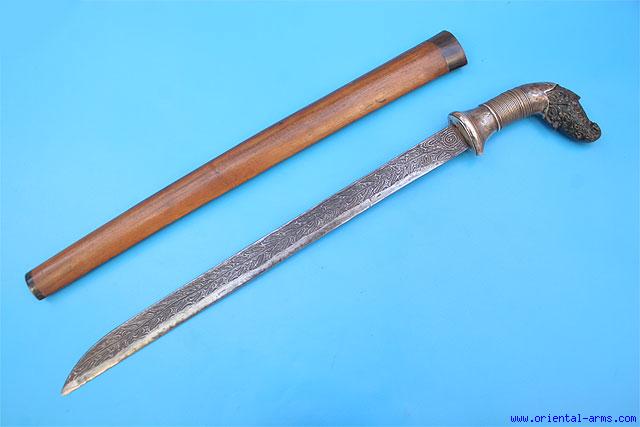 This Parang sword is late 19 C. from Java, Indonesia. The blade is finely forged from twisted steel rods and deeply etched to emphasize the pattern. The handle is beautifully carved horn with silver collar and the scabbard is wood with horn mouth and tip. Blade 18 ½ inches total 26 inches. Very good condition. |