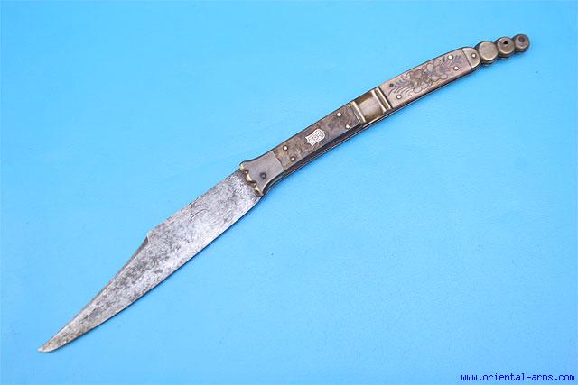 A Spanish folding knife known also as Navaja . It was extensively used in Spain during the 18 and 19 Centuries to cut food as well as to settle personal accounts, and found as a man best companion still today. This one is a 19 Century probably made in France for the Spanish market. Blade is signed TOLEDO, probably a copy of a very similar one made by Beauvoir . 7 inches blade with a 4 inches clipped tip. Handle set with bone and horn panels and brass fittings. Total length 16 inches fully opened. Very good condition. Blade patinated and maker sign worn. Minor worn to the horn panels. |