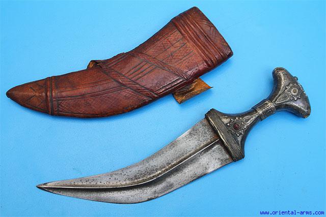 This Jambiya dagger is Yemenite, comoing from South Yemen and known also as Hejaz Jambiya. It is early 20 C. Massive blade with pronounced central rib 8 inches long. Handle of silver with colored stones (two missing . Tooled leather scabbard. Total length 13 ½ inches. Very good condition. Minor dents to the silver on the pommel tips. |