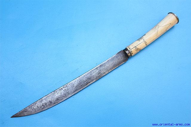 Up for sale is this interesting and unusual Knife, most probably from South China, early 20 C. in the style of a Burmese Dah knife. The 8 ½ inches blade is forged from an old rasp or old file. Elephant Ivory handle with fine and delicate drawing of a mountainous view and Chinese writing. Chase silver pommel cap. Total length 12 ½ inches. Very Good condition. Age cracks on the handle but its holds very solid. No scabbard. |