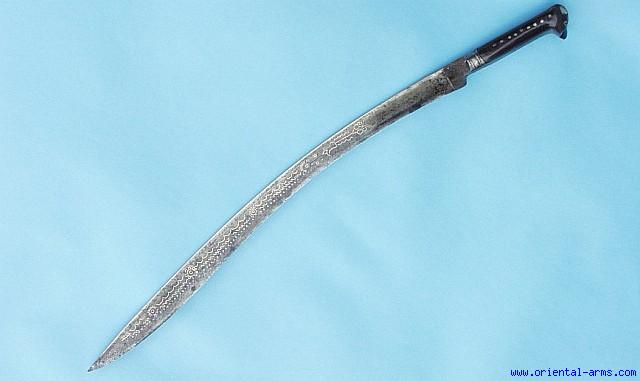 A very fine and interesting example of the “YATAGAN”, the famous Ottoman sword. The Yatagan derives its shape from very old blades. Its peculiar shaped blade has a down curving blade with reinforced spine, and it is found in many weapons in the eastern world from the West Balkan countries to the far Indian sub-continent. Its eared pommel shape is known from very old days and similar pommels were found in swords from Luristan 3000 years ago. This specific example is an early one, late 18 or early 19 C., probably of Turkish origin. It has a 24 inches long blade widening to a maximum at about 7 inches from the tip and heavily inlaid with silver wires. The blade is forged from superb pattern welded (Damascus) steel in the pattern known as Turkish Ribbon which was common to Ottoman blades as from the 17C. The black horn grips with the side ears are mounted on the blade tang and decorated with Mother of Pearl rondels. The grip strap and the blade collar is pewter. Total length 29 inches There is no scabbard. Very good condition. Very few parts of the silver inlay are missing on one side and the blade collar was probably shortened some long time ago. All parts are original, late 18 or early 19 century, no added or restored parts. A very nice example that will be highly appreciated by the connoisseur collector, offered here at a very reasonable price. |