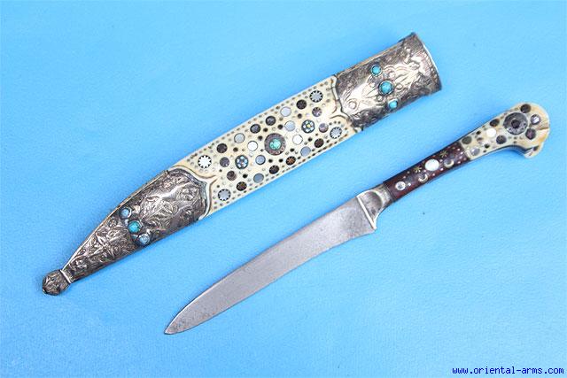 This very fine small knife is Turkish, early 18 C. or earlier. Blade 3 ½ inches forged from fine wootz (watered) steel. The handle is made of sectors of horn and ivory decorated with inserted brass and Mother of pearl rondels and brass nails. Eared pommel set with red stones. The scabbard is ivory decorated en suite with the handle and mounted with chased silver mounts set with turquoise stones. Total length 8 ½ inches. Very good condition. |
