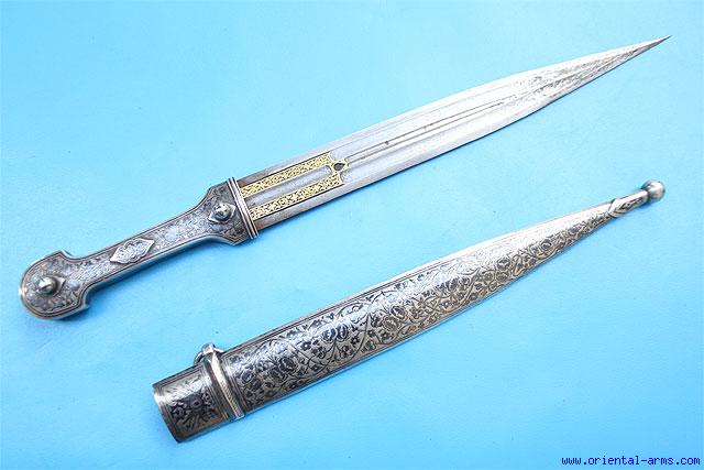 This very fine Qama / Kindjal is made for the Turkish market, probably in the Caucasus, early 20 C. Very good fullered blade with gold inlay decoration and maker stamp and fine etching in the fullers. Blade length 12 ½ inches. Silver handle and scabbard with very fine niello decoration. Of interest is the niello design of the Turkish army insignia on the upper front of the scabbard. Total length 18 inches. Very good condition. Unfortuntely the last four inches of the blade are somewhat pitted. |