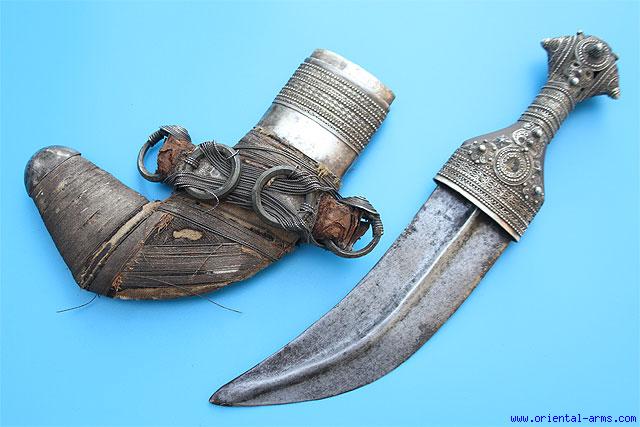 We offer for sale this Arab Jambiya dagger from Oman, in the royal style known as Saidi . It has a well forged, 8 inches long, curved and dual edge blade with a pronounced central rib. The hilt is made of Rhino horn in the classical “I” shaped, decorated with many small silver filigree pieces. The scabbard is “L” shaped covered with fabric. The belt attachment is made of complicate arrangements of 4 silver rings and twisted silver wire. All scabbard and hilt fittings are silver chased in a typical design. Very good condition. Minor losses to the filigree decoration on the handle. The belt arrangement is slightly damaged. |