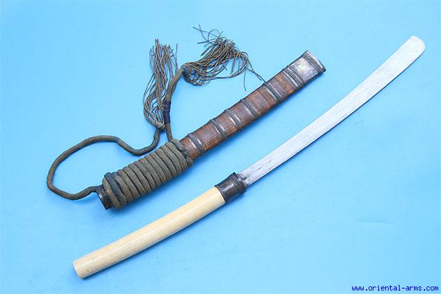 This Short dah sword is probably Burmese late 19 C. Massive blade 17 ½ inches long with cut tip. The two handed grip is 11 inches long, massive ivory tusk with silver collar. Wood scabbard with silver filigree bands. Total length 31 inches. Very good condition.