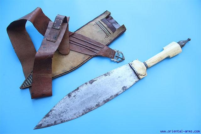 This Billao dagger is early 20 Century and comes from the coastal people of Somalia. It has a classical non-symmetrical leaf shape blade, 10 ½ inches long 2 ½ inches wide. The handle is made of two ivory sectors separated by layers of horn and brass. The pommel cap is silver. Original hide scabbard and leather belt. Total length 18 inches. Very good condition. Blackened spots and edge nicks on the blade. |