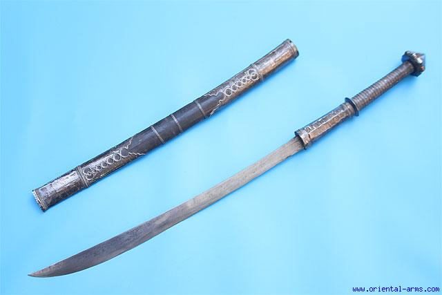Very good two handed Dah sword. Slightly up-curving 22 inches blade of classical form. Two handed 12 inches handle covered with filigree silver bands. Onion shaped silver pommel. Scabbard covered with silver bands and mounts. Total length 36 inches. Very good condition. Dented spots on the handle and scabbard. The big onion shaped pommel suggests a Thai origin. Early 20 C. |