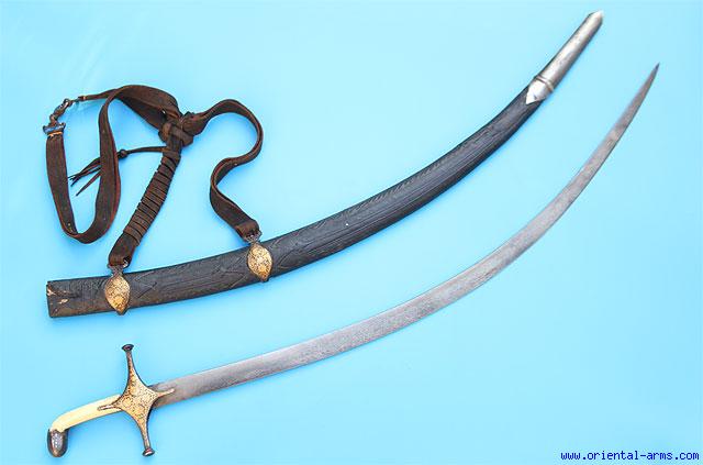 This is a classical fine 19 C. Persian Shamshir sword with 18 C. blade of fine high contrast wootz steel. Blade length 33 inches. Walrus ivory grips and steel cross guard and grip strap finely decorated with gold koftgari work. Original tooled leather covered scabbard with steel belt carrying bands also finely inlaid with gold. Total length 38 inches. Very good condition. Minor losses to the gold inlay work. Minor losses and small repaired damages to the leather cover. This Shamshir comes with a very interesting leather carrying belt with fine steel buckle. |