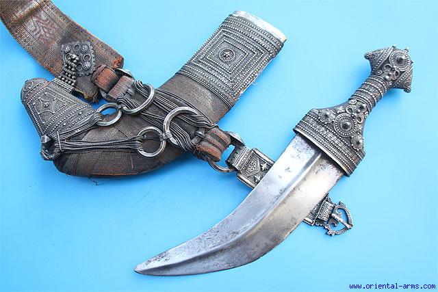 We offer for sale this fine quality Arab Jambiya dagger from Oman, in the royal style known as Saidi . It has a well forged, 8 inches long, curved and dual edge blade with a central rib. The hilt is made of Rhino horn in the classical “I” shaped, decorated with many small silver filigree pieces. The scabbard is “L” shaped covered with fabric. The belt attachment is made of complicate arrangements of 7 silver rings and twisted silver wire (Rare style). All scabbard and hilt fittings are silver chased in a typical design. This dagger comes with the original silver brocade belt with solid silver buckles, 34 inches long. Very good condition. Losses to the fabric on the back of the scabbard. Very complete and impressive Omani dagger.