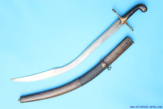 The Kilij is the traditional saber of the Ottomans. It was in use from the early 17 C. and during more than 300 years well into the 20th C. The shorter version with deeply curved wide blade and ‘T’ spine, sometime known as Pala, is a later version and appeared in the mid 18 Century. This Pala has a blade of 27 inches long. The hilt of classical form is made of brass cross guard and horn grips with bulbous pommel and brass grip strap. The wood scabbard is covered with the original leather with spiral stitching and mounted with chased brass locket and chape. Total length 33 inches. Very good condition.