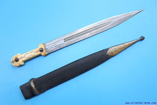 This Qama dagger is mid late 19 C. The finely fullered blade is straight, double edged, 13 ½ inches long. Massive single piece walrus ivory handle of classical form. Original wood scabbard covered with leather and mounted with a gold inlaid belt carrying ring and large chape. Total length 20 inches. Very good condition. Repairs on the grip. |