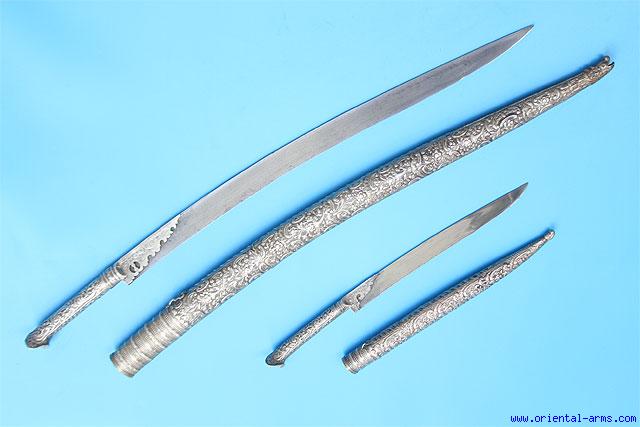 This very fine pair of swords is Turkish, late 19C. It comprises a silver mounted Yataghan and a silver mounted Bichaq short sword. The blades of both items is forged from very fine pattern welded steel in the pattern known as Turkish ribbon. Finely chased silver handles and silver scabbards. Blades 22 and 10 inches. Total 32 and 16 inches. Very good plus condition. Very rare set.
