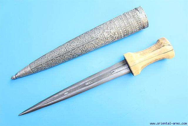 This dagger is late 17 – early 18 C, also known as Court Dagger. It was a side arm of the nobilities visiting the courts of the Ottoman empire. The wootz blade is 11 inches long and tapering to an acute tip with inserted gold and silver stars. The handle is a massive single piece of walrus ivory with very good dark age color. The scabbard is wood covered with finely chased silver. Total length 18 inches. Very good condition. Very minor pitted points on the blade. Minor chips on the ivory. The tip of the scabbard is repaired. Very impressive dagger. |