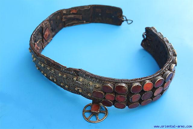 This belt is Ottoman, late 18 – early 19 C. It was supposedly used to gird mail armor, but could have been used by worriers for other or similar purposes. Heavy leather set on the front side with 40 big oval shaped Carnelian stones in silver setting, and mounted with pierced brass plates and steel nails all around. Length about 36 inches. 3 inches wide. Very good condition to age. Some repairs on the leather. One carnelian stone replaced with a coral stone. Very impressive and rare belt. |
