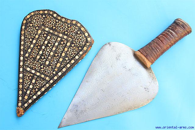 This spear shaped steel blade is coming from Sudan, late 19 C. It is a ceremonial spear or a battle standard. 8 ½ inches long 6 inches wide blade, entirely covered with etched inscription in Arabic letters. Wood grip bound with leather strips. Original and very rare wood scabbard entirely covered with fine mosaic work of many hundreds of small pieces of bone and hardwood. Total length 13 inches. Very good condition. Minor losses to the Mosaic work. |